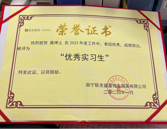 与此同时,另外一位在厦门联发物业集团南宁分公司实习的莫坤上同学,以其出色表现也获得了企业颁发的“优秀实习生”证书,这体现了企业对实习生的高度关注和认可。企业领导表示,这位实习生的专业知识、敬业精神和服务意识都非常出色,是全体员工学习的楷模。企业给予莫坤上同学“优秀实习生”的嘉奖,以鼓励其再接再厉,争创佳绩,也希望更多的员工向他学习,提高项目整体的服务水平。