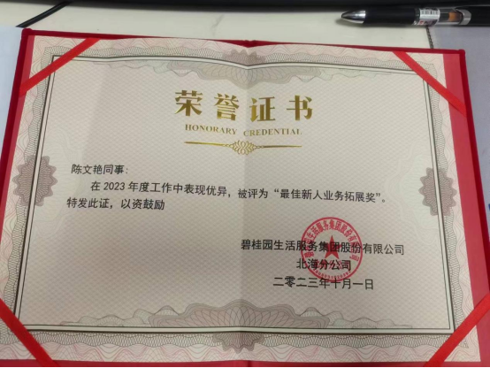 物业2101级陈文艳同学获“最佳新人业务拓展奖”