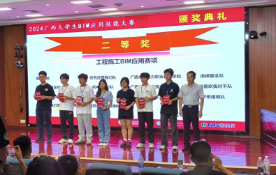 2024年4月27日,由广西壮族自治区教育厅主办,广西安全工程职业技术学院承办,深圳斯维尔科技股份公司协办的“2024年广西大学生BIM应用技能大赛”成功举办,本届大赛共有广西47所高校的203支团队的近千名学生参赛。经过激烈角逐,由绿色建筑与低碳技术学院郭容宽、吴丹、隋岩鹏和罗远华老师指导,施工1队和施工2队,最终在“工程施工BIM应用”赛项中荣获二等奖两项。