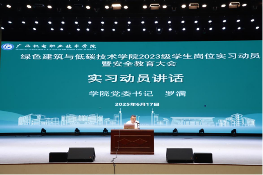 6月17日下午,绿色建筑与低碳技术学院在弘毅楼大礼堂召开2023级学生岗位实习动员大会。学院党委书记罗满,副书记卜庭梅,副院长郭容宽、吴宝勇、学院团委书记、办公室主任、学工秘书、教学秘书、各教研室主任、专业带头人或负责人、2023级实习指导老师及辅导员、2023级全体学生参加会议。