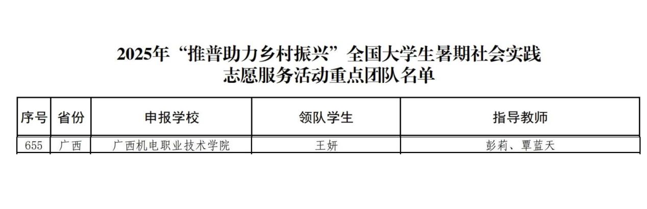 7月3日,教育部公布《2025年“推普助力乡村振兴”全国大学生暑期社会实践志愿服务活动入选团队名单》,我院“红砖筑桂”青年推普助力乡村振兴实践团成功入选该项目重点团队,实践团队由彭莉、覃蓝天两位老师指导。