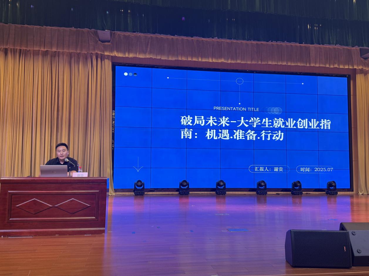 谢贵在报告中首先分享了自己的职业成长历程。作为一名从基层技术员成长起来的技术骨干,他生动讲述了如何通过“十年磨一剑”的坚守与钻研,在电梯维修技术领域追求卓越的奋斗故事。从初入职场时的“死磕到底”,到成为安全管理负责人后对每一个细节的极致追求,他用实际行动诠释了“执着专注、精益求精”的工匠精神。随后,谢贵深入分析了当前就业形势,重点解读了高校毕业生总量增长、AI技术快速冲击、新兴产业人才缺口明显等热点问题。他结合电梯行业和低空经济等新兴领域的发展趋势,详细阐述了传统行业转型与新兴行业崛起带来的就业机遇。在谈到核心竞争力培养时,他强调:“扎实的专业知识是基础,跨学科能力和实践技能是突破职场竞争的关键”。此外,他还就创业政策支持、市场需求空白等要素,分享了创业路径选择的相关经验,鼓励学弟学妹们勇于尝试、敢于创新。