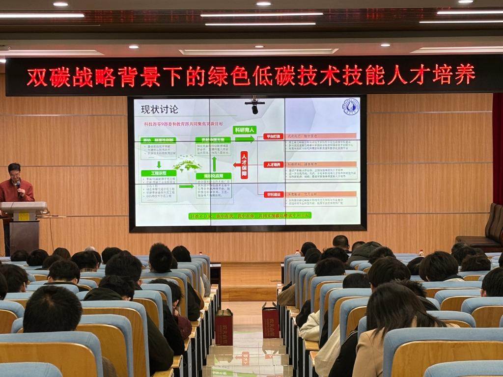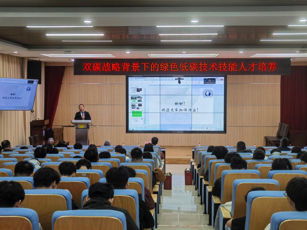 卢教授进一步指出,实现“双碳”目标离不开科技创新与人才培养的深度融合。他特别强调推动风电、光伏、氢能、碳捕集等前沿领域学科建设,以及促进传统专业向绿色化、低碳化转型升级的紧迫性。在育人层面,他提出应通过“打造高水平科研平台、深化产教融合、构建交叉学科体系”等多措并举,系统化培养既懂技术又具备创新能力的复合型技能人才,为贡献“双碳”中国方案提供坚实人才支撑。讲座内容翔实、逻辑清晰,既有理论高度,又紧密贴合职业教育实际,引发了在场师生的广泛共鸣。