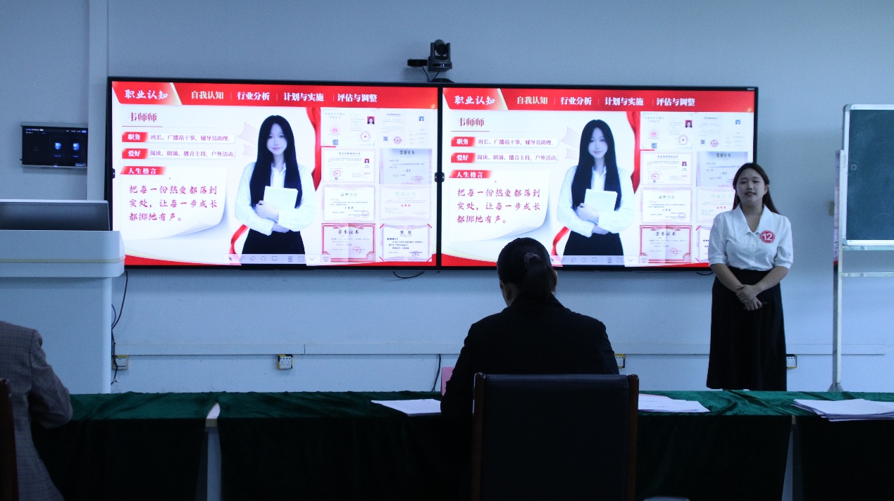 本次比赛分为成长赛道和就业赛道。参赛选手结合自己的实际情况,从自我认知、职业环境分析、职业目标确定、评估与调整等方面出发,结合国家未来发展以及社会需求展示自己的职业规划与求职能力。比赛现场气氛紧张而热烈,参赛选手们多方面分析自己的综合素质,展示自身优秀品质以及与职业目标的契合度,灵活应答评委的提问。