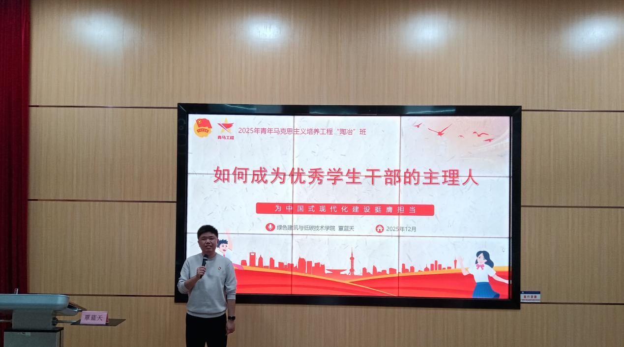 为进一步提升青年学生干部的综合素养,明确学生干部的职责使命,助力学生干部更好地发挥桥梁纽带作用,2025年12月30日,绿色建筑与低碳技术学院学生第二党支部书记覃蓝天面向学院第七期“青年马克思主义者培养工程”陶冶班学员开展“如何成为优秀学生干部的主理人”主题授课。