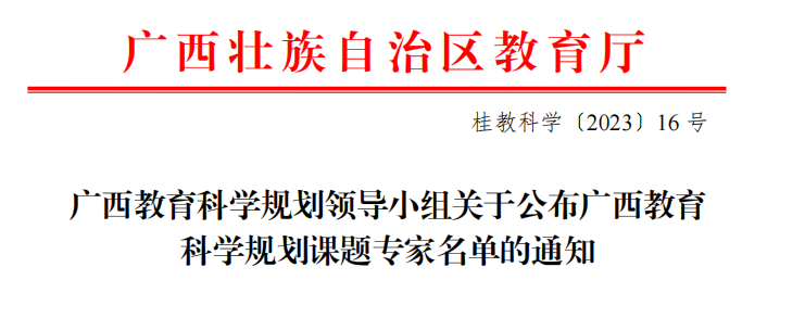 近日,广西教育科学规划领导小组发布通知,万象城官网黄政艳教授等8名教师入选广西教育科学规划课题专家库。这标志着万象城官网教师在教育科研方面的专业能力和贡献得到广西教育科学规划领导小组的认可。