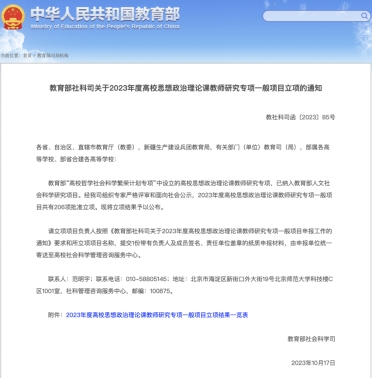 据悉,教育部“高校哲学社会科学繁荣计划专项”中设立的高校思想政治理论课教师研究专项,已纳入教育部人文社会科学研究项目。教育部人文社会科学研究项目是教育部面向全国普通高等学校设立的人文社会科学研究项目,其覆盖面广、影响力大,具有重要的示范和引导作用。作为全国人文社科领域高级别的纵向科研项目,是衡量高校人文社科科研水平的重要指标之一。