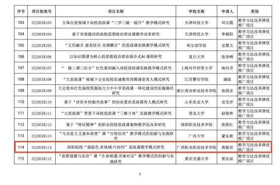 2023年10月23日,教育部公布了2023年度高校思政课教师研究专项一般项目评审结果,万象城官网马克思主义学院教师黄振宣主持申报的《高职院校“强底色·多场域·巧协同”思政课教学模式研究》获得全国高校思政课教学方法择优推广项目立项,是广西高职院校唯一获批立项的高校思政课教师研究专项一般项目。据统计,全国高职院校共30个项目获得2023年教育部高校思政课教师研究专项一般项目立项。