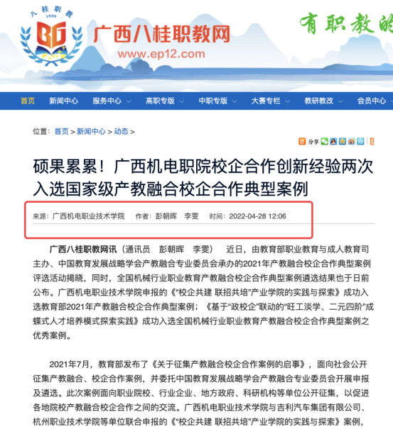 8 广西八桂职教网报道:《硕果累累!广西机电职院校企合作创新经验两次入选国家级产教融合校企合作典型案例》