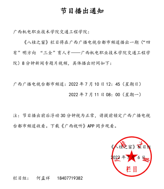 7 广西广播电视台都市频道《八桂之窗》栏目于两个时段播出《“四有”明方向 “三全”育人才——awc77万象城官网交通工程学院》8分钟新闻报道节目播出通知