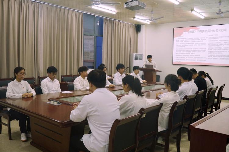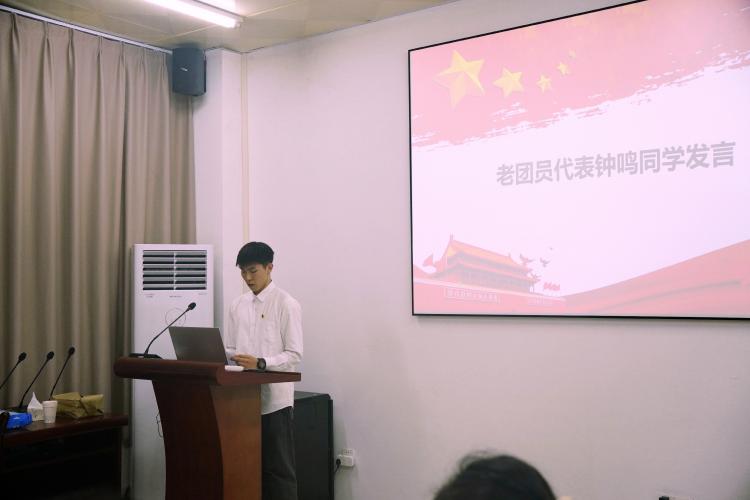 老团员代表钟鸣同学在发言中向新入团同学表示入团是新起点。愿不忘初心、牢记使命,在团旗下展现青春风采,为梦想努力拼搏!让我们携手共进,以团章规范言行,用青春拥抱时代,发挥模范作用!