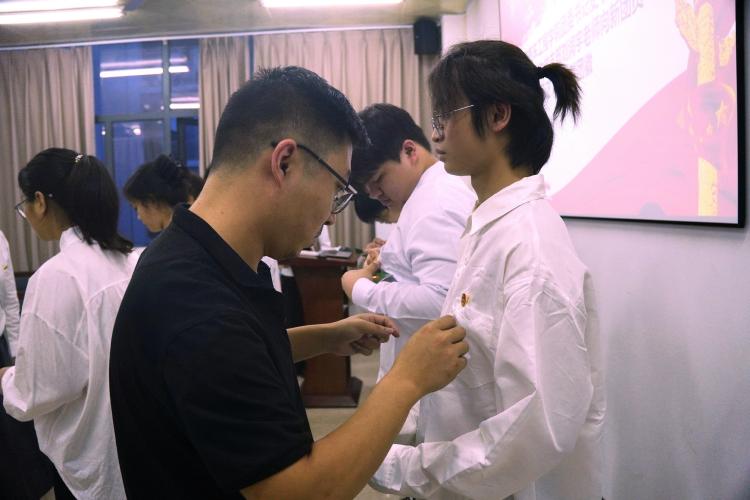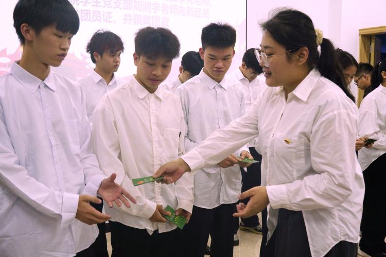 刘润宇老师在宣布了本次新团员名单之后,老师们为新团员颁发团员证并佩戴团徽。团徽在胸前熠熠生辉,团员的责任也铭记于心,激励着他们不忘初心,奋楫前行。