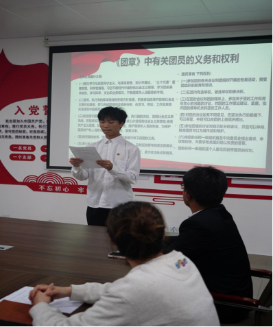 汽车工程学院宁聪同学作为入团介绍人宣读《团章》中有关团员的义务和权利,明确团员必须履行的义务及团员享有的权利。
