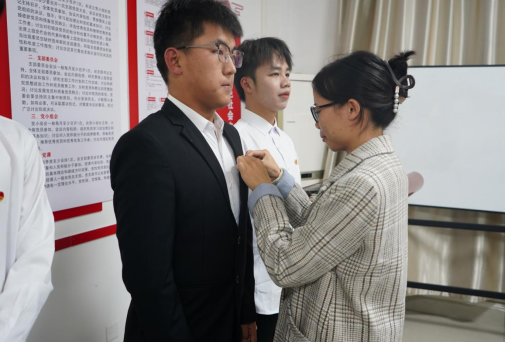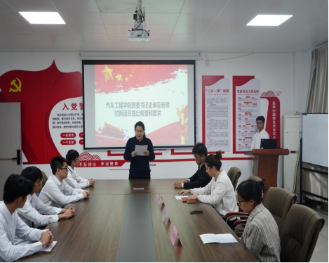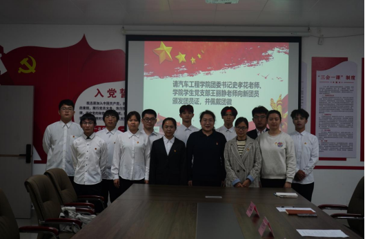 汽车工程学院团委史孝花书记、学生党支部王丽静老师为新团员颁发团员证、佩戴团徽。团徽是代表共青团的徽章,是团员身份的象征,是肩负重任的标志,提醒着青年团员时刻牢记自己的团员身份。新团员们接过的不仅仅是一枚团徽,更是代代相承的红色理想与信念。