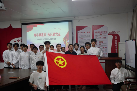 青年兴则国兴,青年强则国强。党有号召,团在行动,共青团员争做时代接班人。2024年12月6日晚上,我院在汽车工程学院1+x实训室二楼会议室举行“青春献祖国,永远跟党走”为主题的新发展团员入团仪式。此次入团仪式由周庆德同学主持,参加此次入团仪式的有汽车工程学院团委书记史孝花老师、汽车工程学院学生党支部王丽静老师、周伟一老师,以及在校的新老团员。本次入团仪式议程共有九项。