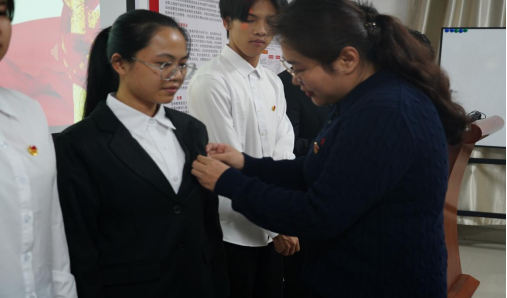 第三项:团委书记向新团员颁发团员证,并佩戴团徽