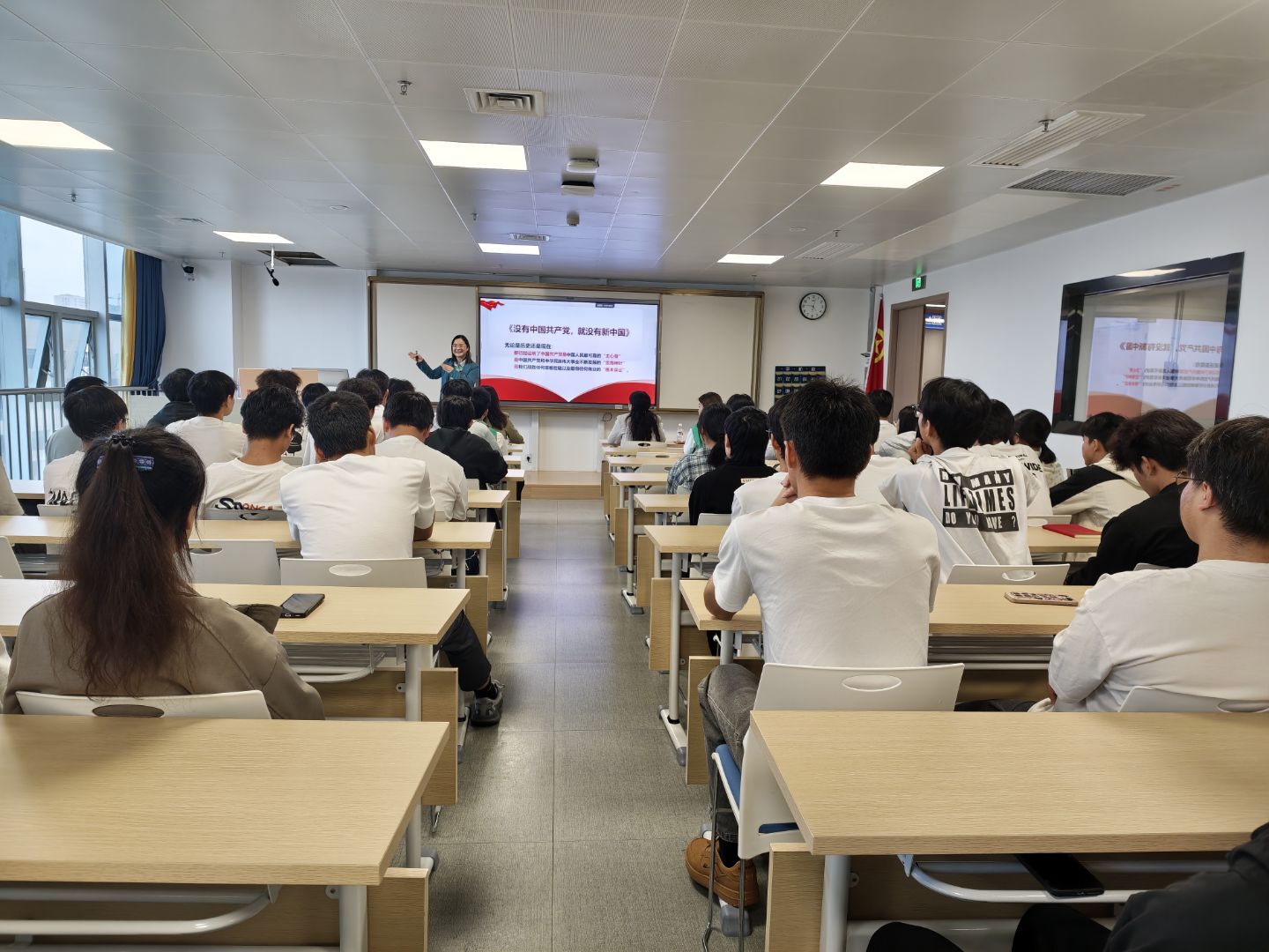 最后,针对“青年可为,奋斗何以作答”,石教授为学员指明了具体方向:成长成才的根本前提是“坚定不移听党话、跟党走”,核心目标是成为“有理想、敢担当、能吃苦、肯奋斗的新时代好青年”。课上,石教授还以“你觉得生在我们这样的祖国幸福吗?”“你觉得生在我们这样的祖国安全吗?”“你觉得生在我们这样的祖国自豪吗?”三个直击人心的问题,引发学员深度共鸣,进一步激发了大家的家国情怀与责任意识。