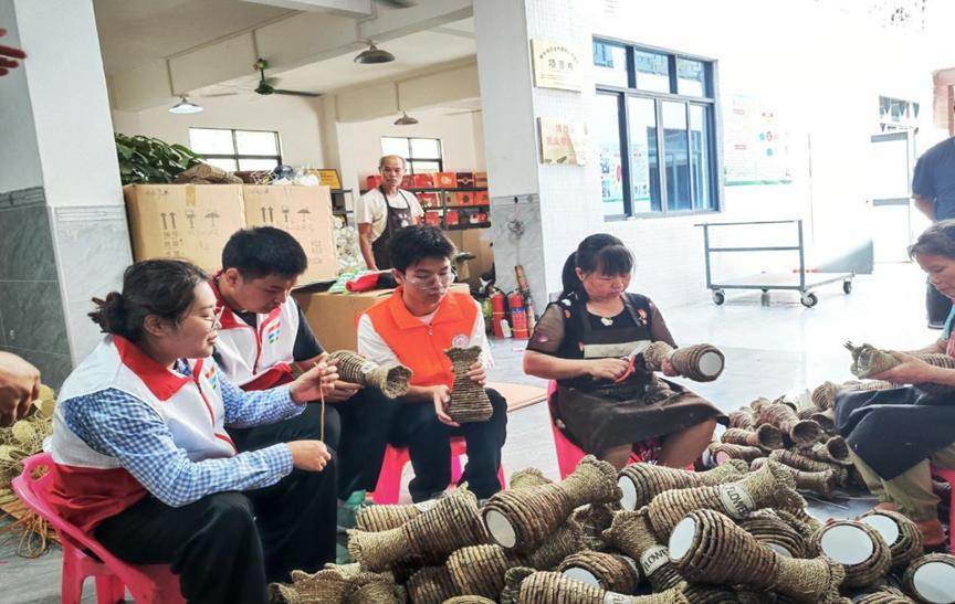 “青焰燎原”团队将推普工作与乡村文化挖掘相结合:收集整理非物质文化遗产“芒编”技艺中的术语表达,制作成图文展板在村广场展出。团队成员还积极学习芒编技艺,并制作了自己的第一份成果,团队成员表示这次实践活动不仅仅是一份“实践”经历,更是一份“传承”的延续。