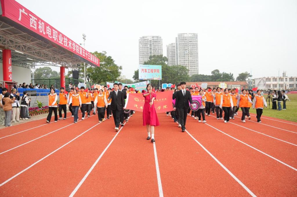 校运会开幕式上,我院学生代表方阵身着统一橙色的服装,步伐坚定、自信从容、精神抖擞,昂首阔步地走过主席台。他们齐声高喊口号“魅力汽车,齐心协力,汽车学子,挑战自我”,声音铿锵有力,充满了青春的朝气与活力。“少年自有少年狂,身似山河挺脊梁,敢将日月再丈量,今朝唯我少年郎……”。这一刻,他们不仅是汽车工程学院的骄傲,更是新时代青年的代表,用自己的行动诠释着青春的价值与意义。