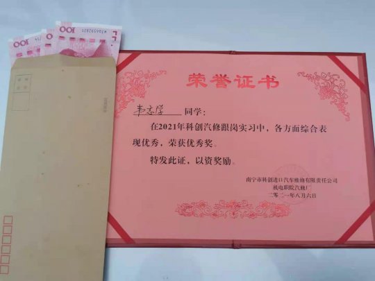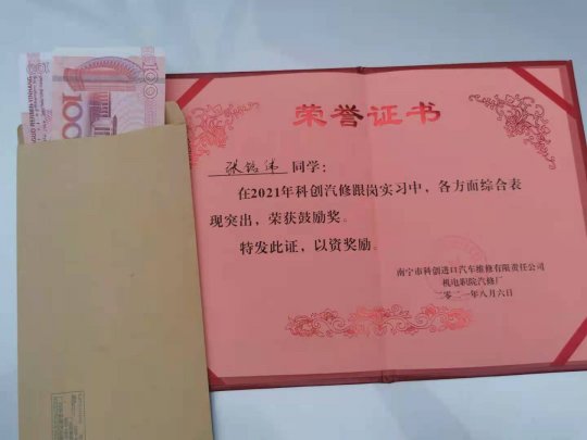 跟岗实习学生获得“鼓励奖”的证书和奖金