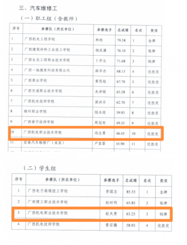 2021年7月29日,我学院冯志勇老师,赵夫贵同学,参加了全国乡村振兴职业技能大赛广西选拔赛。在比赛前,他们排除各种艰难,克服种种困难专心训练,比赛时他们竭心尽力的角逐在各项比赛中,最终获得较好成绩。冯志勇老师获得汽车维修工职工组第十名,赵夫贵同学获得汽车维修工学生组铜奖。