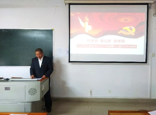 2021年1月25日下午,汽车系党总支召开题为 “新思想 新论断 新举措”的主题党课,由汽车系党总支书记刘波带领系部全体党员进行十九届五中全会精神和文件的学习。 会上,刘书记对十九届五中全会要点进行了导学导读,明确了《中共中央关于制定国民经济和社会发展第十四个五年规划和二〇三五年远景目标的建议》中的要点,强调了全会提出12项重要举措。报告内容思路清晰,重点突出,全体党员认真领悟并做好学习记录。 会后,刘波书记还布置了更深入更具体的学习内容,督促各支部要开展民主生活会,不断学习和领会全会精神。