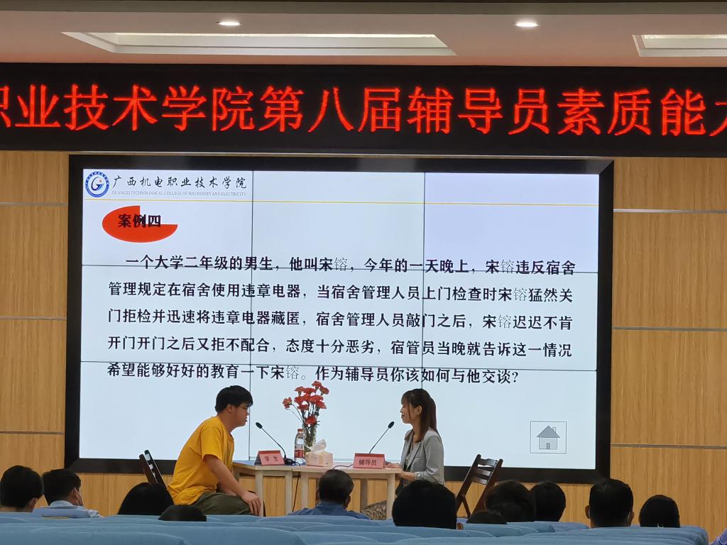 在比赛现场,我院参赛的两位辅导员凭借着多年辅导员工作的经验,以专业的职业素养以及良好的临场应变能力,针对学生在党员发展、心理健康、人际关系、学风建设、学校疫情防控等方面遇到的学生管理典型案例问题和学生思想、心情困惑积极破解难题。在赛场,从容镇定,从情入手,出情入理、情理交融,完美的演绎了大学生“知心朋友”和“人生导师”的角色,精彩的表现获得了现场观众阵阵热烈的掌声。