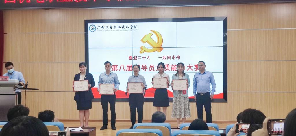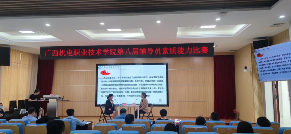 2022年4月8日下午,“喜迎二十大·一起向未来”——第八届辅导员素质能力大赛(决赛)在学校第二学术报告厅举行。经辅导员自愿报名,学生工作处资格审查,共有 14 名专职辅导员进入到本轮决赛环节。我院专职辅导员(党总支副书记)覃媛及专职辅导员张舒铭作为我院专职辅导员代表参加了决赛。