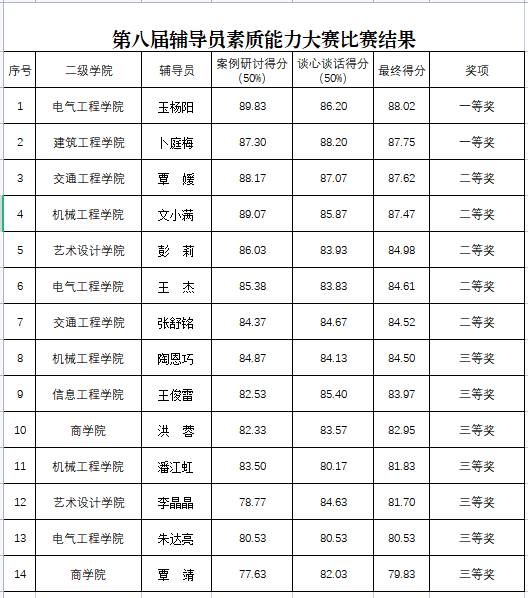 通过紧张激烈的角逐,我院专职辅导员(党总支副书记)覃媛以总分第三名、专职辅导员张舒铭以总分第七名的优秀表现,同时荣获了本次大赛(决赛)“二等奖”的好成绩,较好的展示了我院学生管理工作队伍的专业化水平,有力彰显了我院学生思政工作队伍在学院“三全育人”工作过程中的新面貌、新担当和新作为。