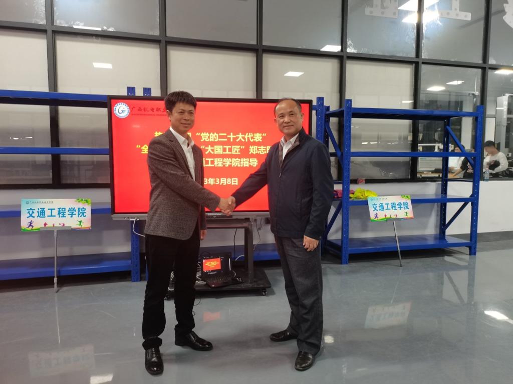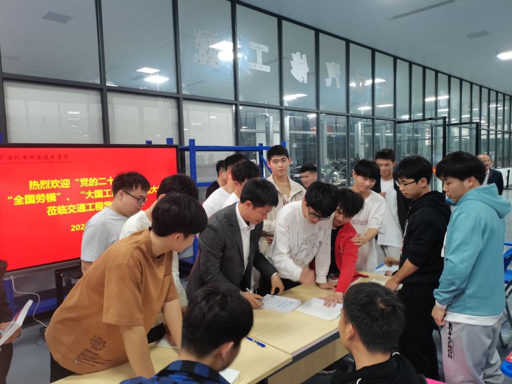 2023年3月8日下午,党的二十大代表、全国劳动模范、广西首位“大国工匠”、广西汽车集团有限公司首席技能专家郑志明大师受邀到万象城官网宣讲党的二十大精神。宣讲会结束后,郑志明大师热情应邀参观了我院教育教学成果展及“双高”建设文化长廊,同时,还实习走访参观了我院新建的新能源汽车实训中心,并给在现场上课的汽检2103班、汽检2103班全体学生上了一堂干货满满的“大国工匠思政课”。学校党委陈科鹤副书记携二级学院班子成员全程陪同。