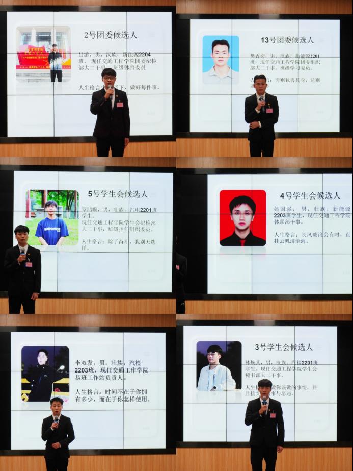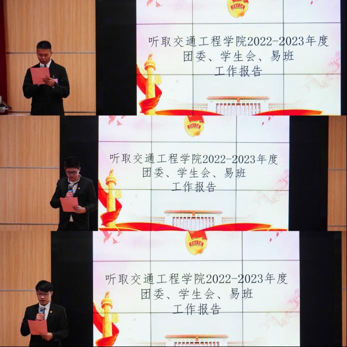 交通工程学院团委纪检部干事吕游,学生会纪检部陈伟聪,易班工作站覃朝阳分别做2022-2023年度团委、学生会、易班工作报告。在团学易带领下,本年度我院的各项工作以及各项建设一直稳步前进,不仅取得了令人骄傲的成绩,更为我们积累了宝贵的经验。