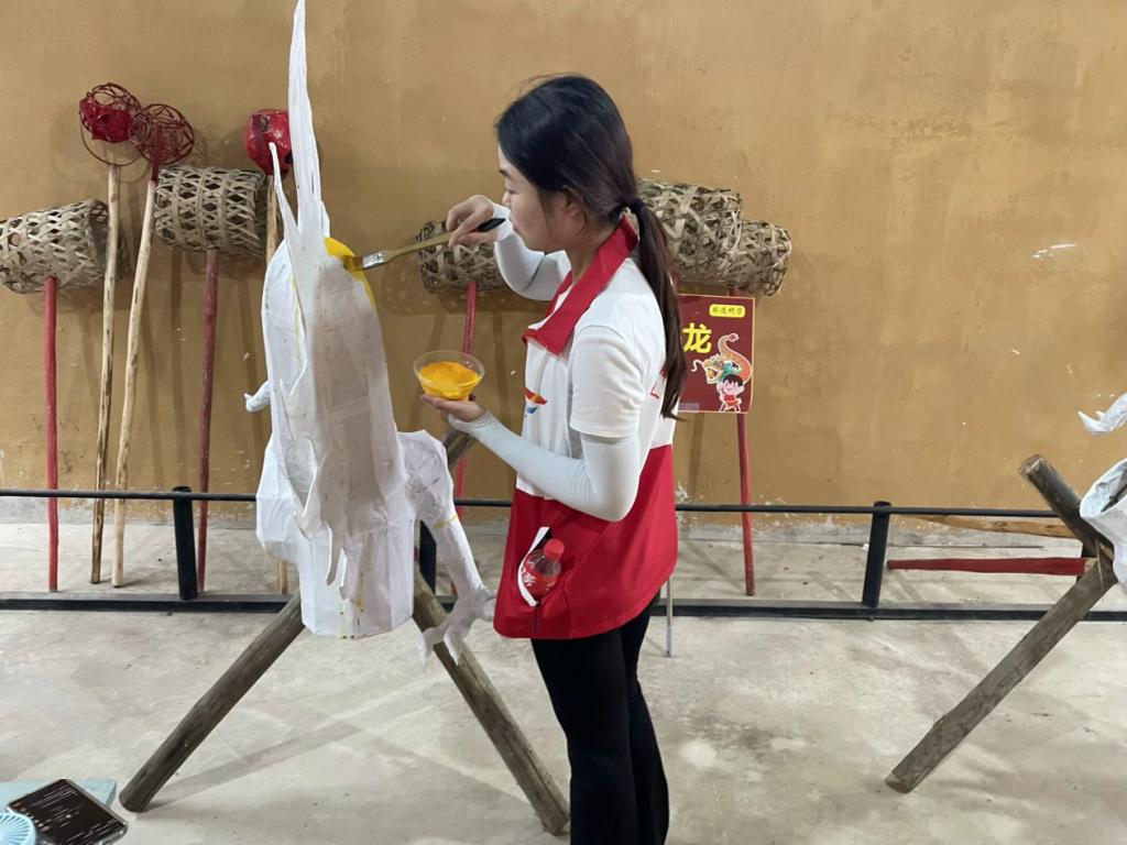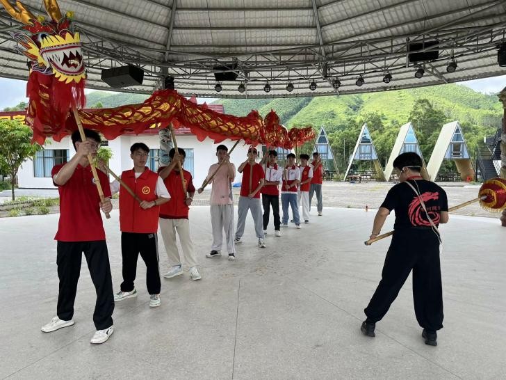除了工业探秘,此次研学活动还融入了丰富的文化体验。7月13日下午,同学们来到宾阳万兴炮龙文化园,同学们在炮龙传承人的带领下,亲手制作炮龙,体验了从扎龙爪到剪龙头、画龙鳞、贴龙鳞的全过程,亲自体验了传统手工艺的魅力与乐趣。随后的舞龙表演更是将活动推向了高潮。在欢快的锣鼓声中,同学们身着传统服饰,手持炮龙,随着音乐的节奏翩翩起舞。他们时而翻腾跳跃,时而盘旋环绕,将炮龙的威武与灵动展现得淋漓尽致。在团队协作中,同学们不仅展现了青春的风采与活力,更深刻体会到了团结合作的重要性。这次炮龙制作与舞龙表演的文化体验活动,不仅让同学们在轻松愉快的氛围中感受到了传统文化的魅力与乐趣,更激发了他们对传统文化的热爱与传承意识。