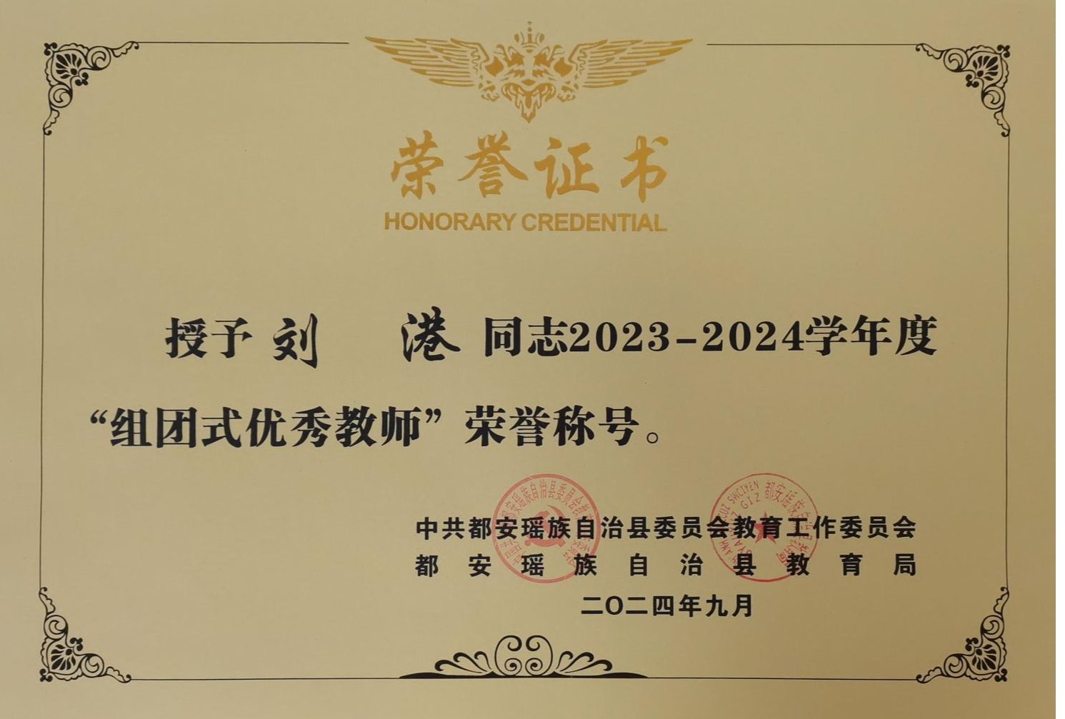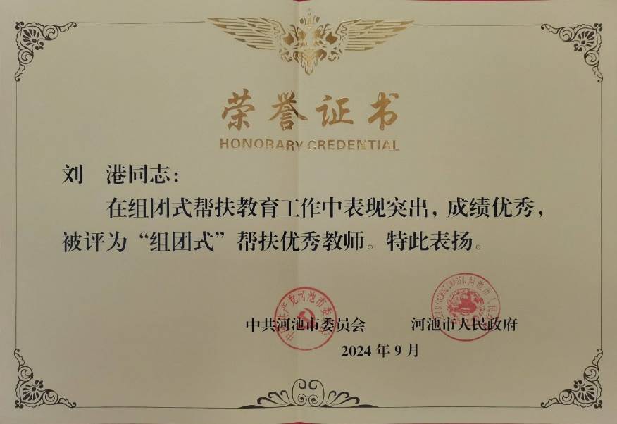 我院党员教师刘港于2024年2月开始至今在都安瑶族自治县职业教育中心开展“组团式”帮扶工作,期间工作表现优异,被中共河池市委员会授予“组团式”帮扶优秀教师荣誉称号。
