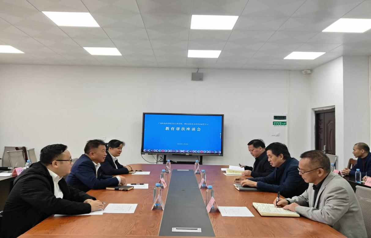 教育帮扶座谈会上,汪大木校长对我院一行的到来表示热烈欢迎,汪校长指出,以赛促教是加强专业建设的重要抓手,职教中心正在积极准备参加河池市或者自治区一级的职业技能竞赛,希望通过以赛促教的方式提高职业教育的质量。刘港老师在帮扶期间的工作,无论是对学校的专业建设、学生的技能训练,还是团队间的交流提升都给予了极大的帮助,帮扶成效显著提升,希望未来两校之间进一步加强沟通与协作,共同探索中高职之间的有效衔接,为职业教育的发展共同努力。彭朝晖院长指出,本次活动的目的,一方面代表学院基层党组织关心、慰问刘港老师,另一方面也要感谢都安瑶族自治县职业教育中心对刘港老师工作的支持和帮助。在中高职衔接方面,不论是专业建设还是课程建设,也希望职教中心作为汽车工程学院的后援单位在相关项目申报、技能培训等方面给予更多的支持,双方共同探索交流、共同提升。