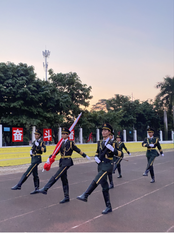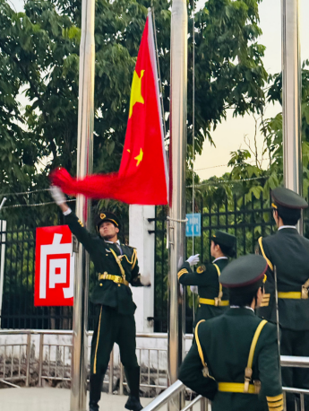 在晨曦的映照下,国旗护卫队迈着整齐有力的步伐,护送五星红旗走向升旗台。他们身姿挺拔,步伐矫健,展现出高度的纪律性和使命感。随着激昂的《义勇军进行曲》响起,升旗手振臂一挥,五星红旗缓缓升起,在微风中舒展飘扬。我院全体师生面向国旗行注目礼,高唱国歌,歌声嘹亮,响彻校园。