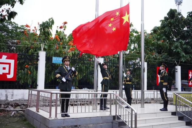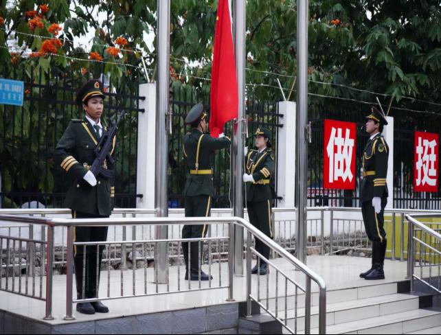 升旗仪式正式开始。国旗护卫队迈着铿锵有力的步伐,护送鲜艳的五星红旗走向升旗台。随着雄壮的《义勇军进行曲》响起,全体师生肃立行注目礼,齐声高唱国歌。在朝阳的映照下,五星红旗冉冉升起,迎风飘扬,庄严的仪式激荡着每一位师生的爱国热情。
