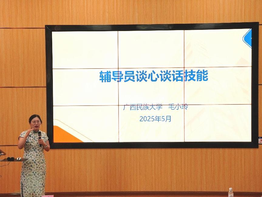 在专家领航环节,学校大学生心理健康教育中心主任董蓓以详实数据分析了当前大学生心理健康状况,特别针对辅导员在日常谈话排查中存在的共性问题进行深入剖析。来自广西民族大学心理健康教育中心的特邀专家毛小玲作《心理普查后谈心谈话原则和注意事项》专题授课,并结合典型案例系统讲解心理普查后谈心谈话的积极人际关系、参与性技术、心里赋能等关键知识和技巧。