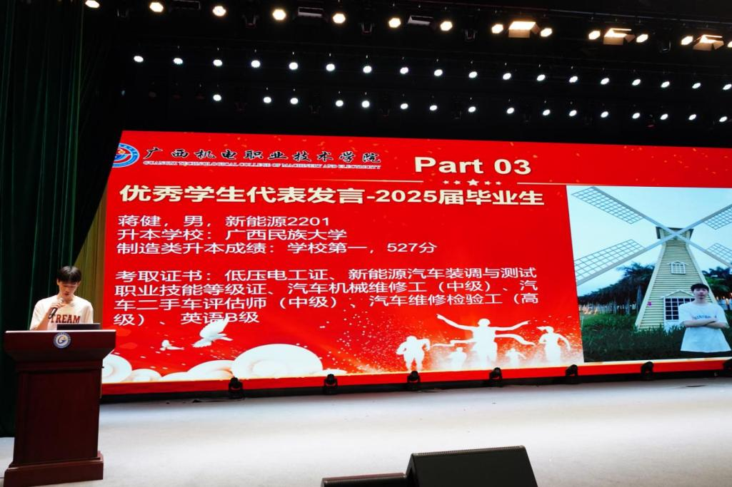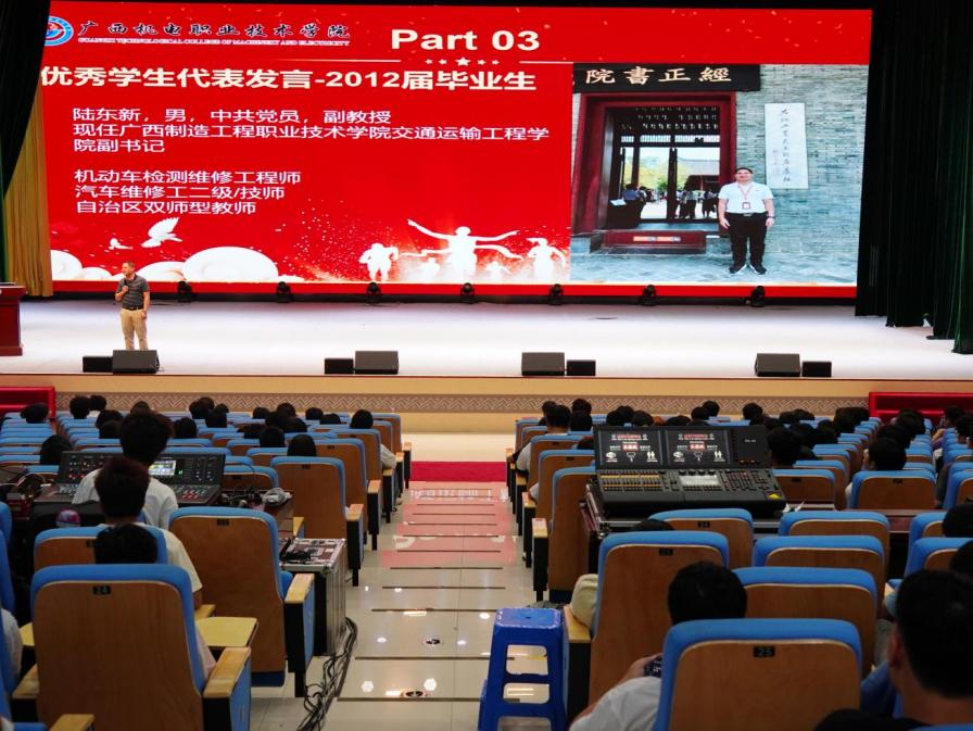 大会气氛在优秀校友及应届毕业生代表的发言环节被推向高潮。原汽配0901班学生,现任广西制造工程职业技术学院交通运输工程学院副书记的优秀校友陆东新,他提出了“我从哪里来?”“我要到哪里去?”“怎么去?”三个问题,并通过自身成功逆袭的故事激励学弟学妹们勇于挑战自我;来自新能源2201班的应届毕业生代表蒋健,则从当下备考的实际情况出发,分享了自己是如何怎么从一个普通的在校大学生,在坚定升本目标后,刻苦奋战,成功逆袭考上广西民族大学的实战历程,呼吁学弟学妹们要勇敢地试一试,为梦想拼搏。