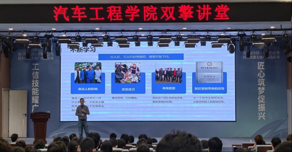 熊文建是吉利集团“首席工人”“十大工匠”称号获得者,拥有35年钣金专业工龄,参与过10款车型研发制造,被誉为车身钣金“主任医师”。讲座中,他以“匠心火种代代永续”为主题,结合自身从学徒到技能大师的成长经历,讲述了在钣金专业领域的实践探索与心路历程。