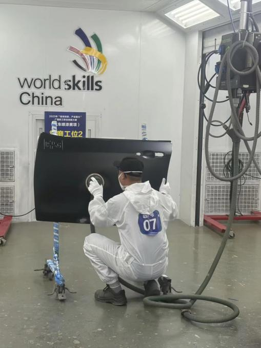 理论考试于11月19日举行,考试内容对标《国家职业技能标准》高级工及以上水平要求,涵盖行业核心知识体系,重点检验选手专业技术理论功底。实操比赛则在德技楼六楼汽车喷漆世界技能大赛集训基地开展,分为中涂底漆前处理、免磨底漆喷涂、面漆及清漆喷涂三大模块,选手需完成从打磨、遮蔽到喷涂、缺陷处理的全流程作业。