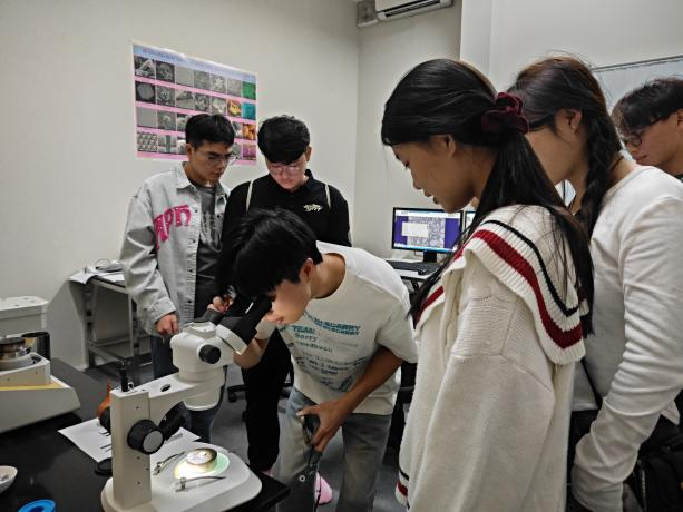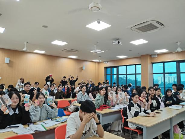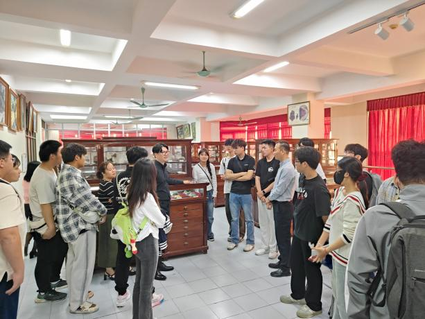 研学团研学的第一站——越南河内矿业地质大学。在河内矿业地质大学,该校国际合作处负责人阮处长详细介绍了学校在矿业工程、地质勘探等领域的学科优势,双方围绕专业课程设置、实训基地建设等议题展开深入交流。研学团还实地参观该校机电工程学院实验室与地质博物馆:在电气工程学院实训室,学生亲手操作该校的实训设备,体验东南亚矿藏检测技术;在地质博物馆内,陈列的稀土矿标本与数字化地质模型引发师生的热烈讨论。此外,研学团与该校中文专业学生开展“同上一堂中文课”主题交流活动。在课堂上,中越双方青年就“如何学习汉语”进行交流,课堂氛围热烈而活跃。课堂尾声,研学团向越方学生赠送了精心准备的绣球、书签、漆扇等中国礼物,两国青年在互赠礼物中深化文化认同,多名越南学生当场表示:“我要努力学好中文,希望将来能有机会到中国学习。”