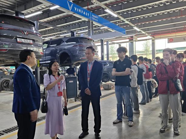 研学团的第三站——越南新能源汽车标杆企业VinFast 4S店和长青(越南)工厂。在VinFast 4S店,研学团近距离观察东南亚新能源汽车市场生态。在工作人员的引导下,师生试驾VinFast最新车型,体验其针对热带气候优化的电池散热系统与智能驾驶辅助功能。在长青(越南)公司工厂,研学团深入智能仓储、无尘车间等核心区域,见证中国企业在东盟的智能制造实践。新能源汽车技术专业学生韦同学感慨:“从课堂理论到企业实践,从中国标准到越南适配,我真正理解了‘工匠精神’在不同文化中的共同内核——对技术的极致追求。”