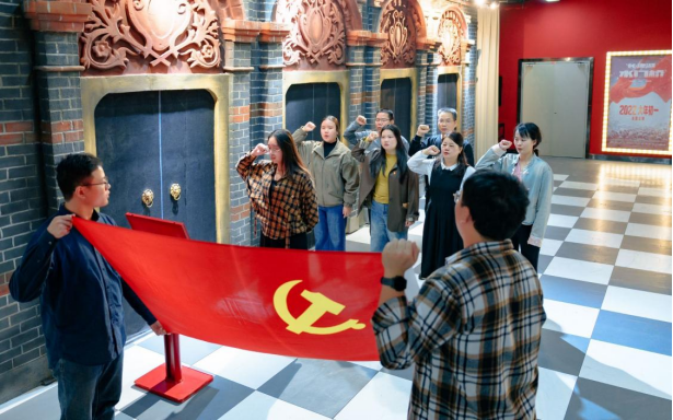 活动现场,党员们在讲解员带领下参观红色教育展区,透过抗战影像、电影道具和英雄事迹展板,重温中国共产党领导人民浴血奋战的壮阔历程。面向鲜红党旗,全体党员庄严举起右拳,重温入党誓词,齐唱红色歌曲《红船启航》,铿锵誓言与嘹亮歌声交织成“为党育人、为国育才”的庄严承诺。