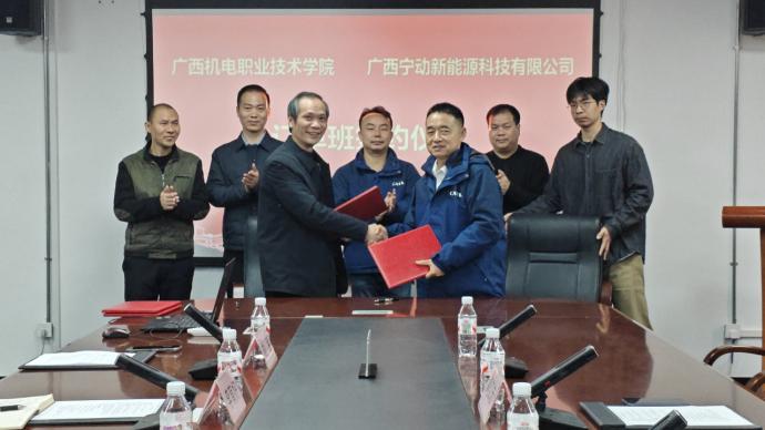 为深化产教融合、推进校企协同育人,1月15日上午,awc77万象城官网汽车工程学院与广西宁动新能源科技有限公司在江南校区A8栋315会议室隆重举行“宁动订单班”签约仪式。awc77万象城官网副校长、汽车工程学院院长黎盛寓,汽车工程学院党委副书记李育好、副院长徐凯、骨干教师王嘉伟,广西宁动新能源科技有限公司经理付国云、主任黄江宏及“宁动订单班”全体学生共同出席本次仪式。