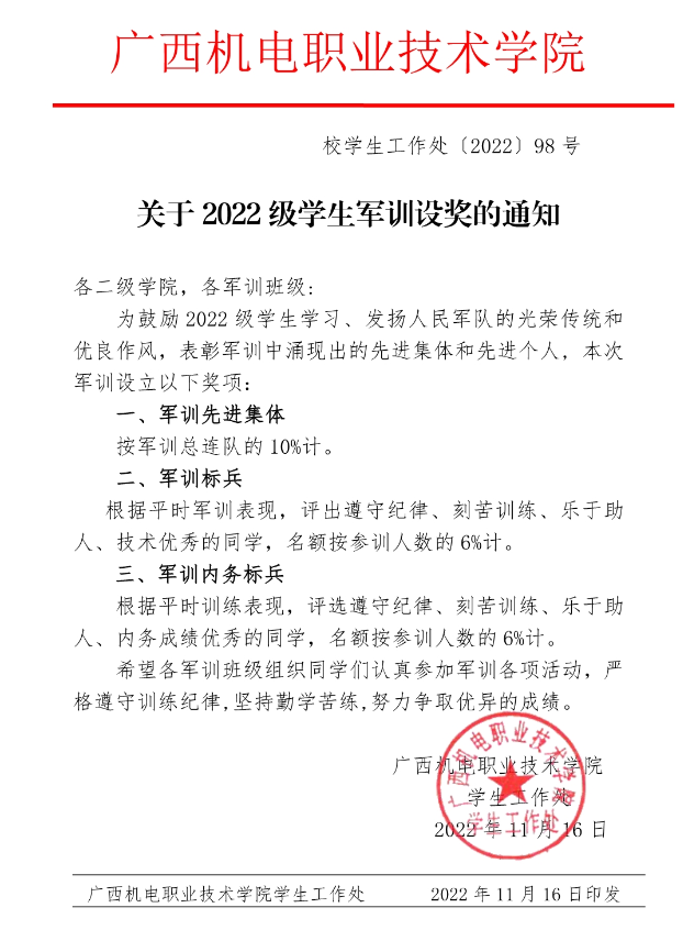 关于2022级学生军训设奖的通知