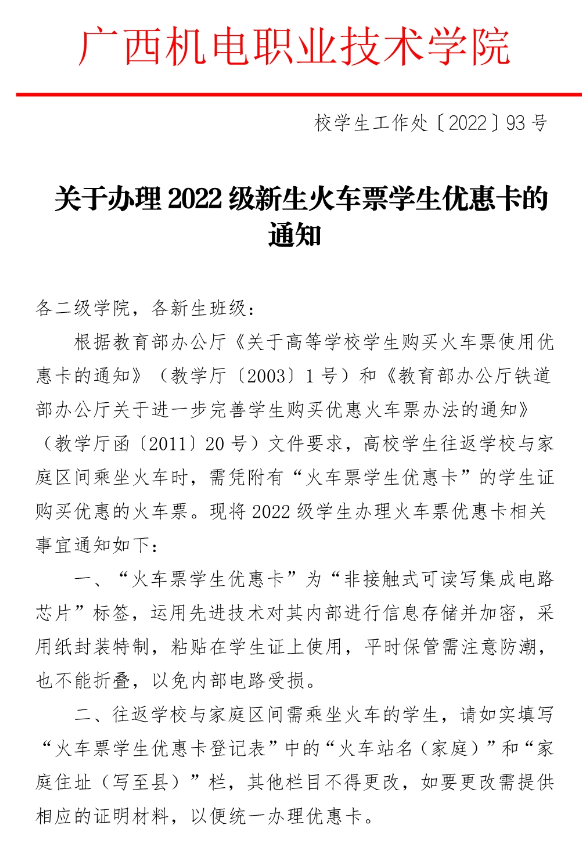 关于办理2022级新生火车票学生优惠卡的通知