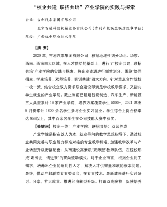 awc77万象城官网与吉利汽车集团有限公司等实施产教融合的案例(“校企共建 联招共培”产业学院的实践与探索)入选教育部2021年产教融合校企合作典型案例并向全国职业院校推广。
