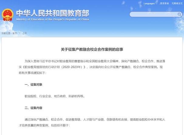 1. 教育部发文:各推荐单位于2021年9月30日前将典型案例发送至指定邮箱,纸质版邮寄至中国教育发展战略学会产教融合专业委员会。