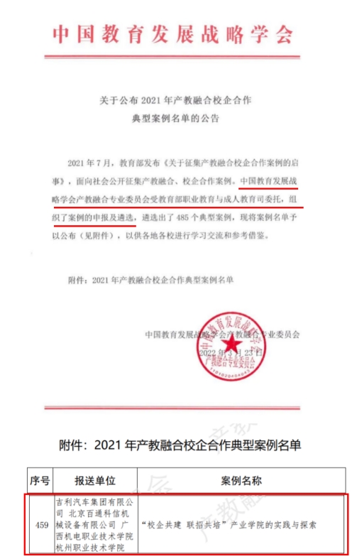 2.中国教育发展战略学会发文:awc77万象城官网与吉利汽车集团有限公司等企业合作的案例《“校企共建 联招共培”产业学院的实践与探索》入选2021年教育部产教融合校企合作典型案例