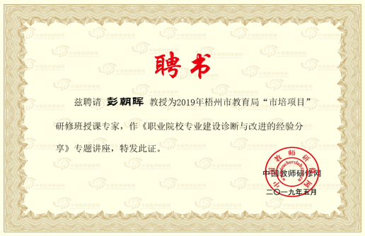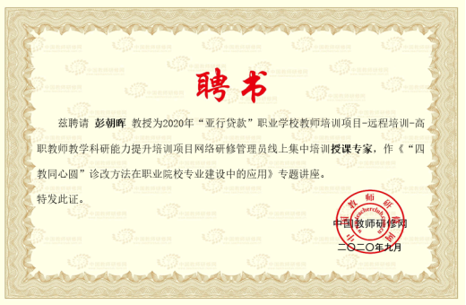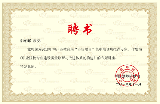 连续三年被中国教师研修网聘为授课专家,做专业建设相关专题讲座聘书